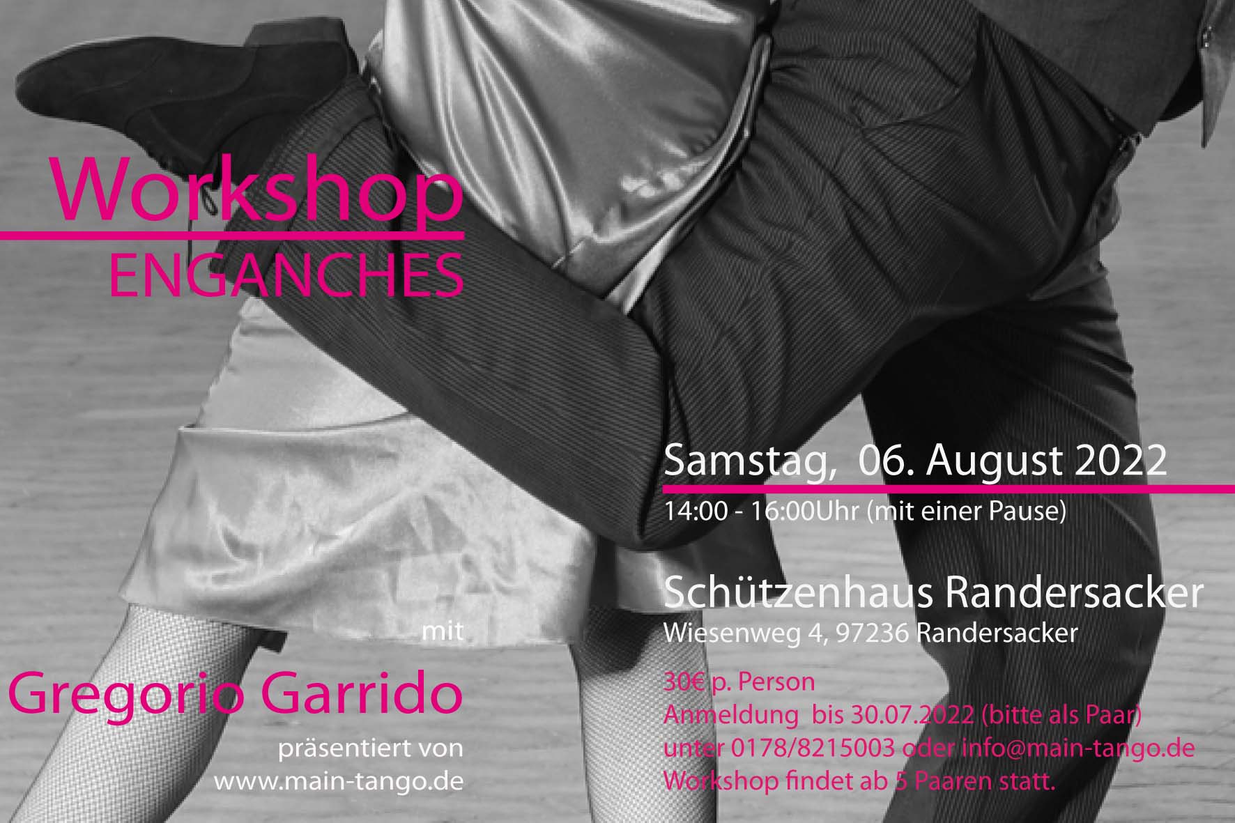 Kosten je Teilnehmer 30€, bitte paarweise bis zum 30.07.2022 unter info@main-tango.de anmelden
