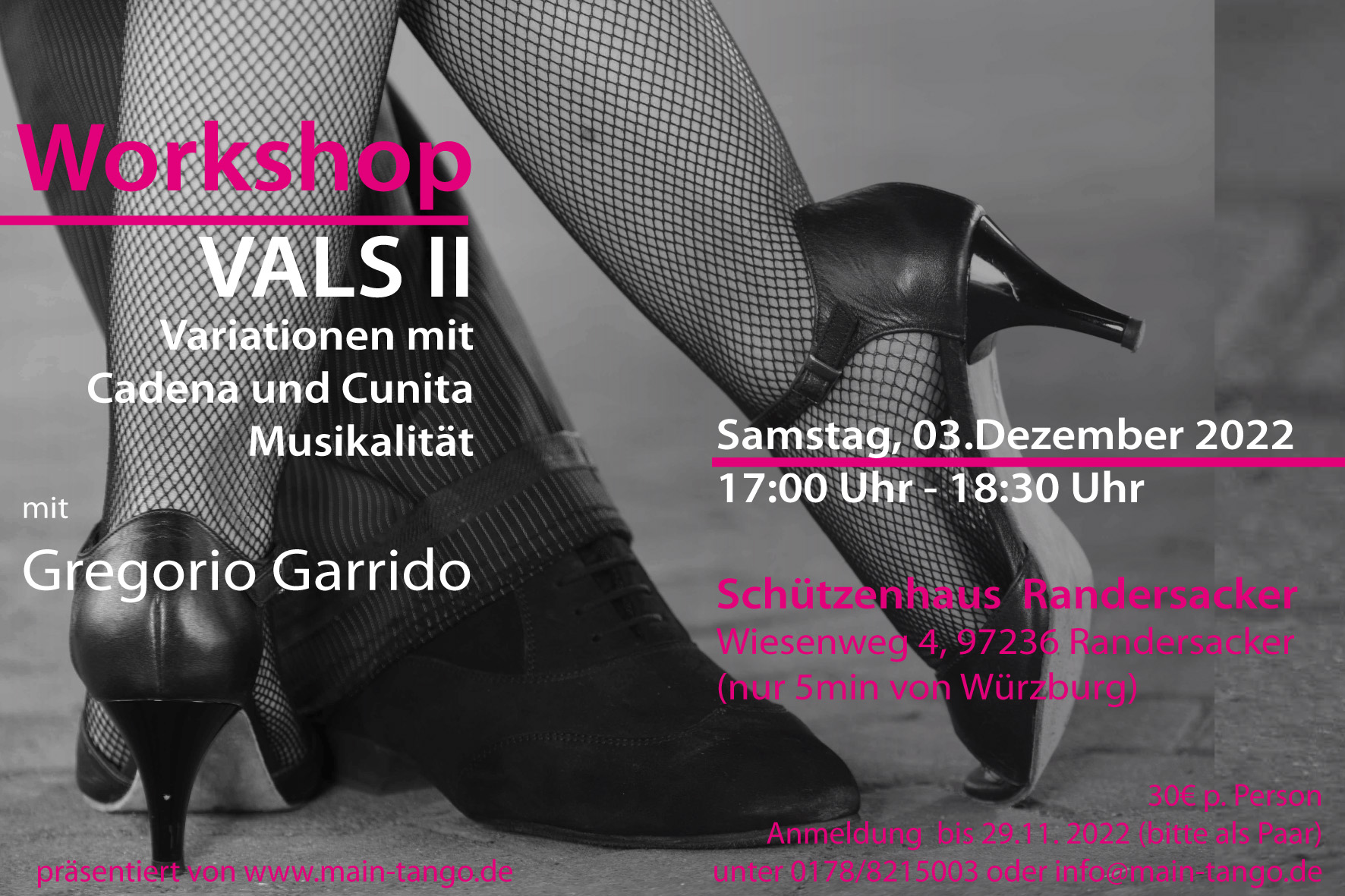 Kosten je Teilnehmer 30€, bitte paarweise bis zum 29.11.2022 unter info@main-tango.de oder 0178 821 5003 anmelden
